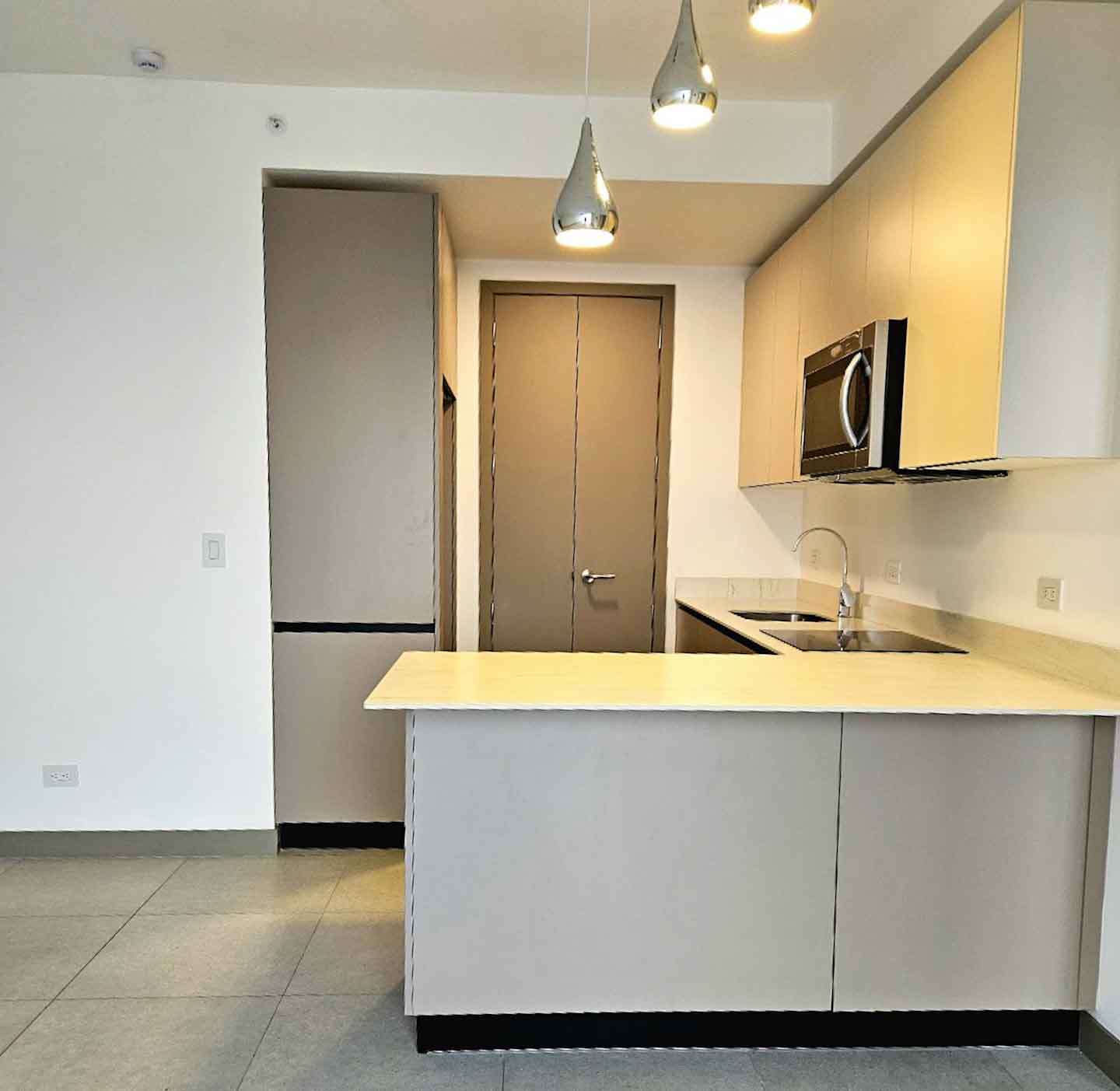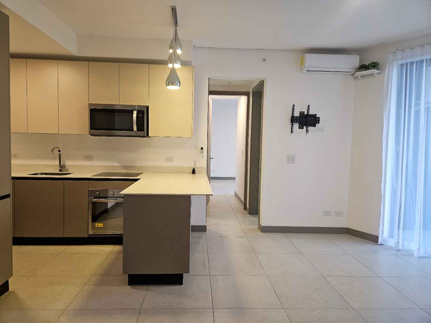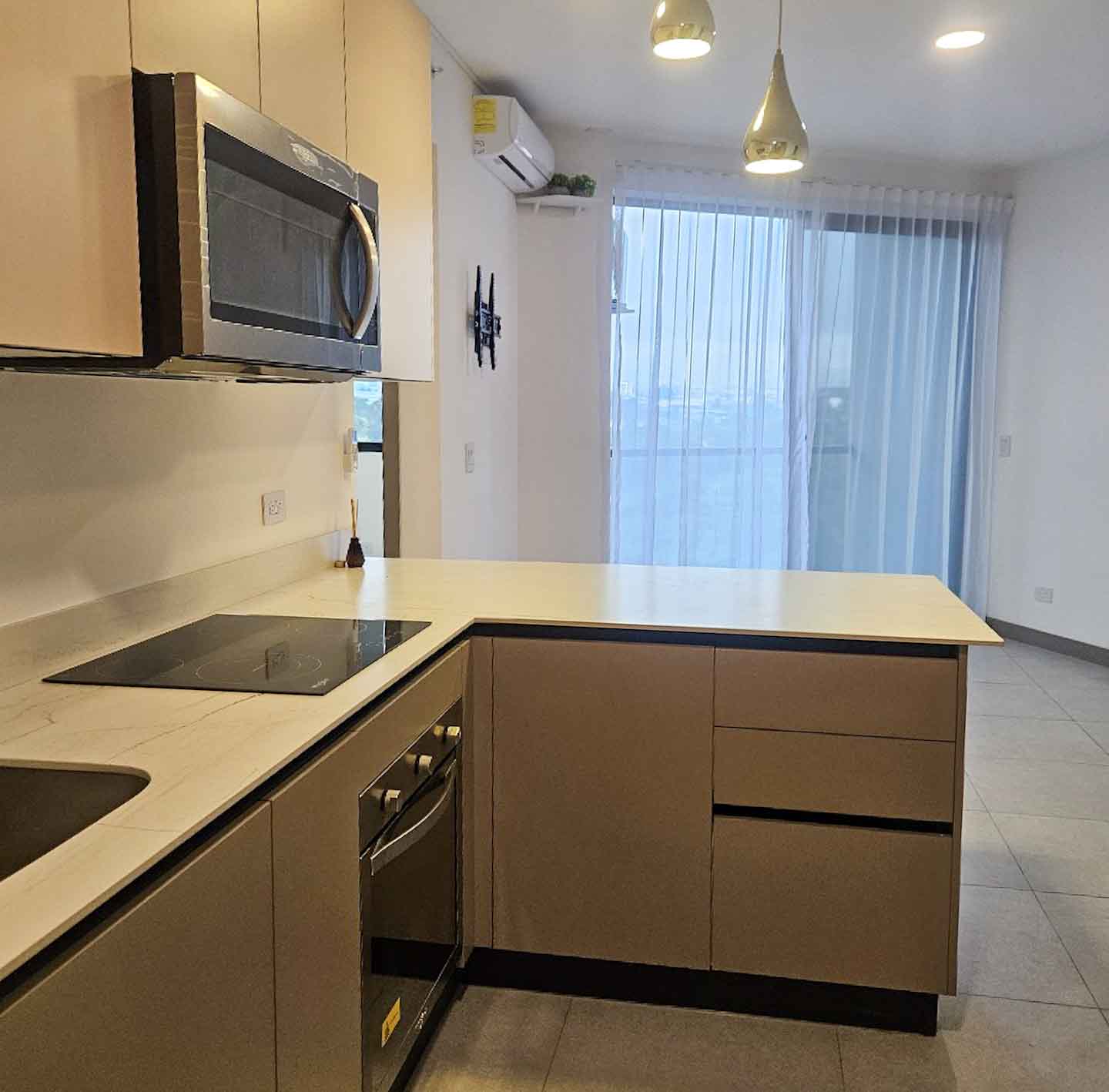• Cocina moderna equipada con encimeras de cuarzo, cocina eléctrica, horno, microondas y refrigeradora.