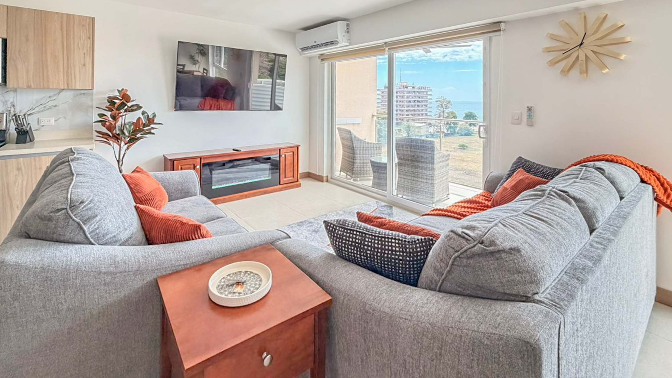 - Chimenea con control remoto, TV de 70” y sofá cama estilo americano