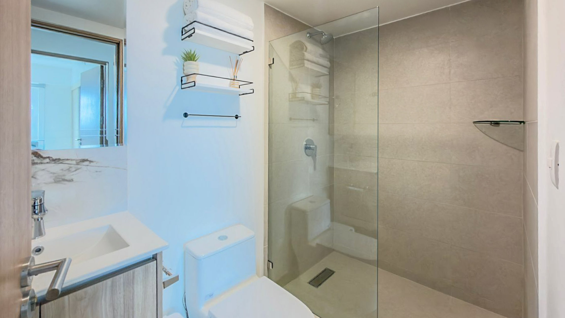 - 2 baños con mamparas, estantes y accesorios