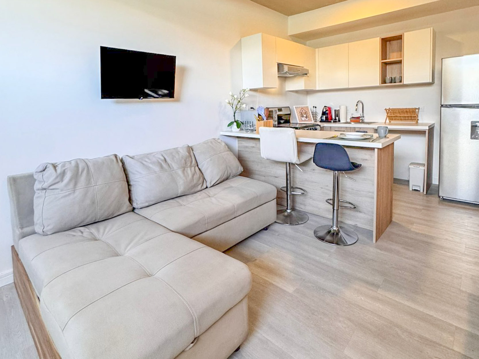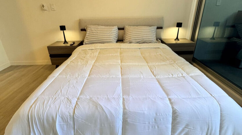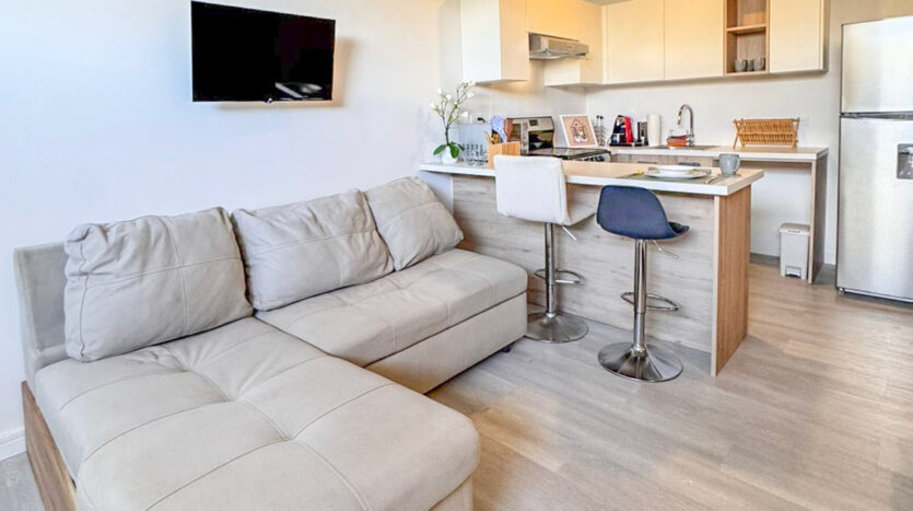 El apartamento cuenta con 39 m² de construcción, distribuidos en un espacio abierto con cielos altos y un diseño moderno, incluyendo una cocina con muebles importados y pisos laminados de PVC de alta resistencia. Uno de los grandes atractivos es su terraza de 9 m², accesible a través de ventanales de pared a pared, ideal para disfrutar de la tranquilidad y la vista al aire libre.