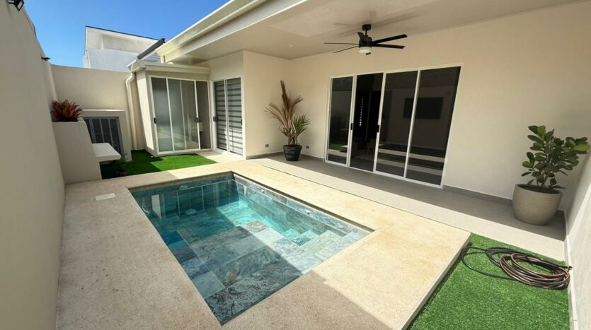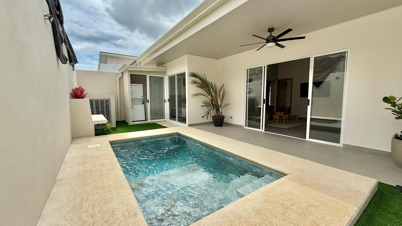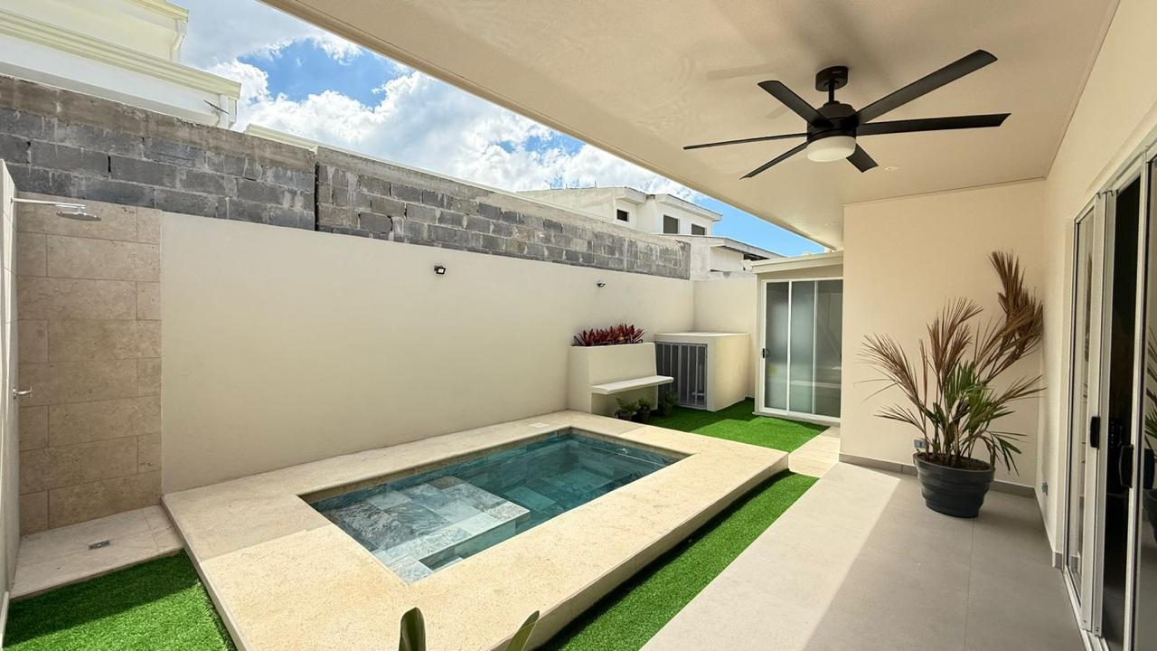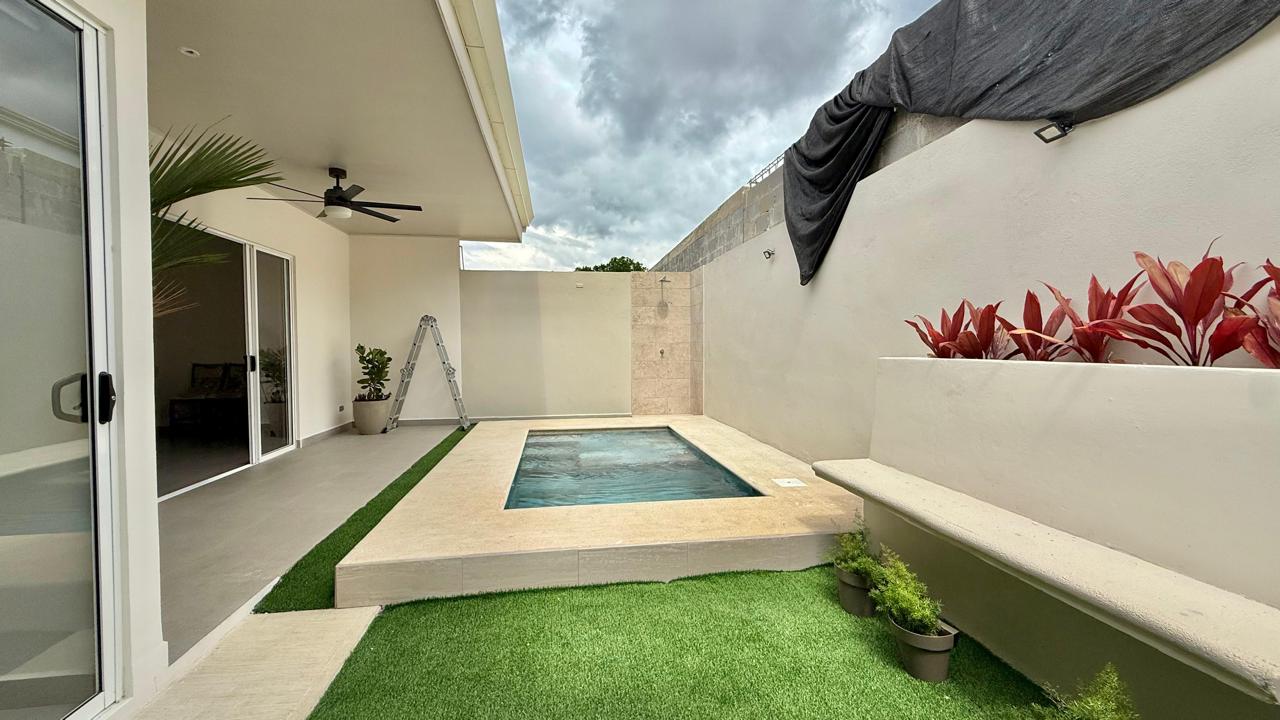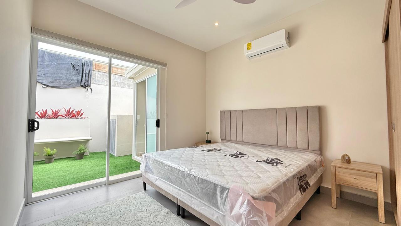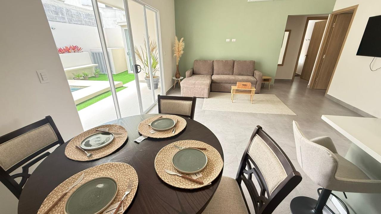 Las puertas de vidrio conectan el área social con la terraza y la piscina privada, logrando una integración ideal entre espacios interiores y exteriores. El patio cuenta con muro perimetral posterior, brindando mayor privacidad y seguridad para disfrutar del clima tropical.