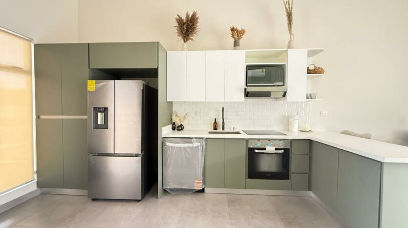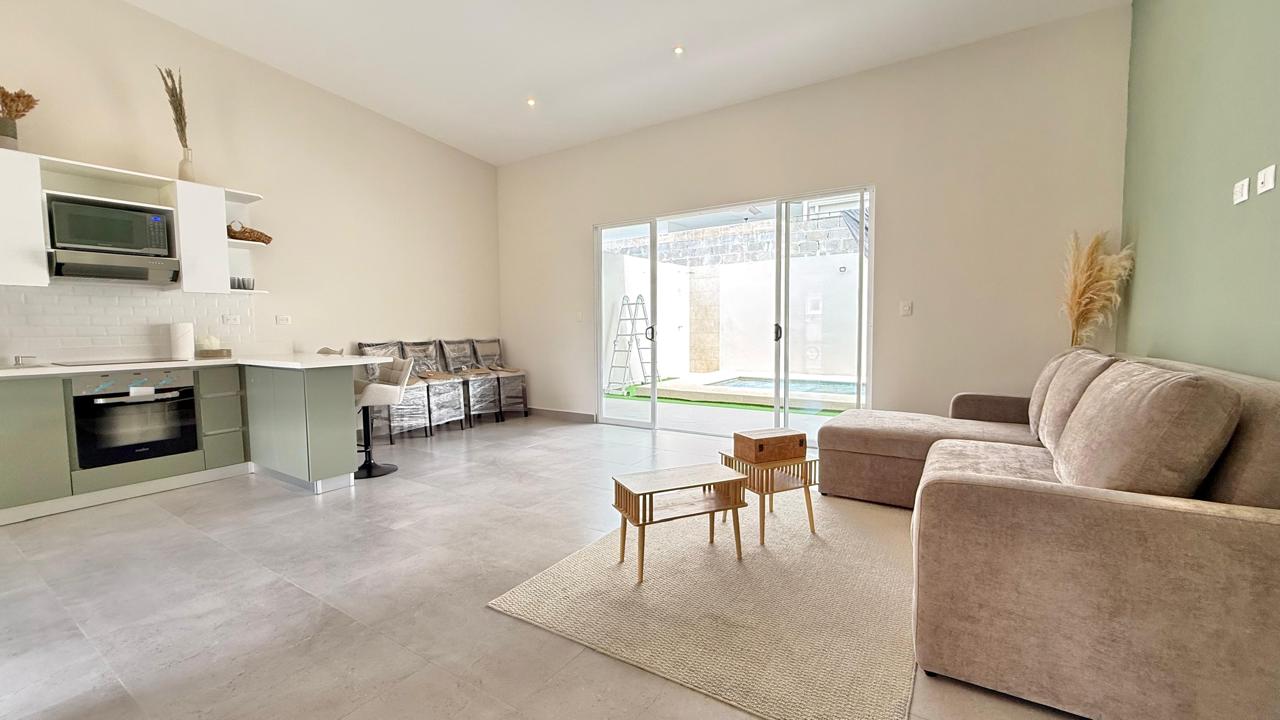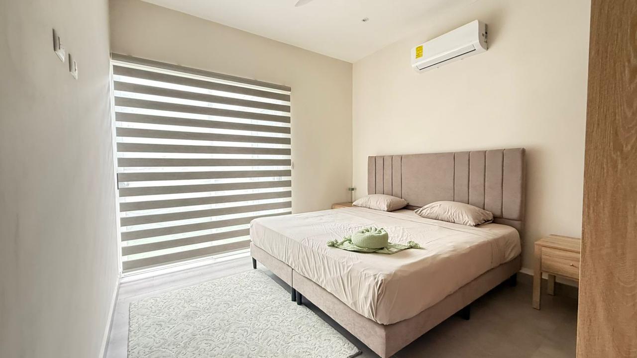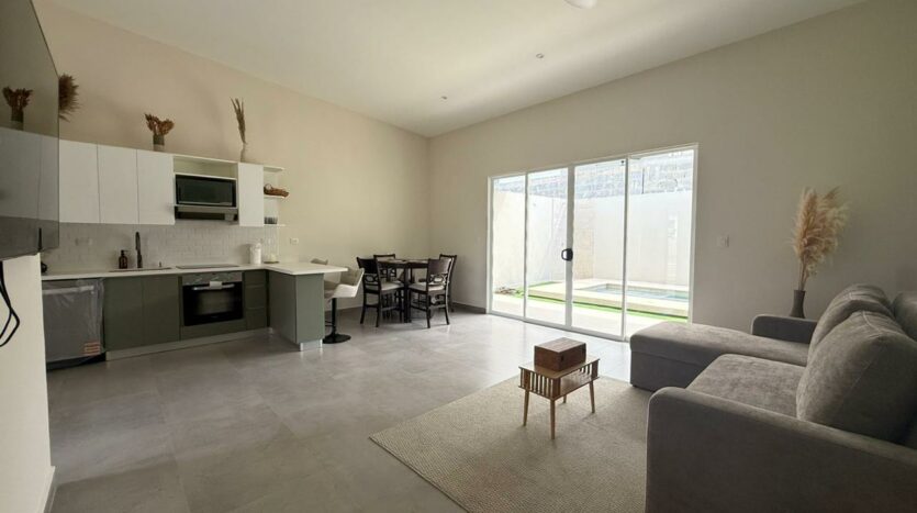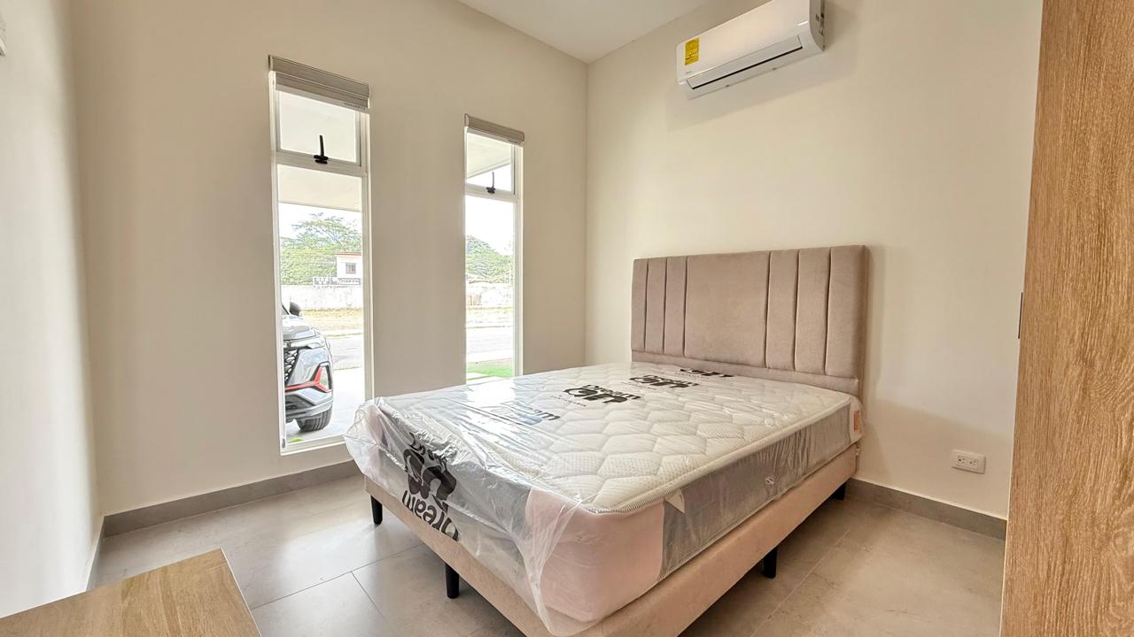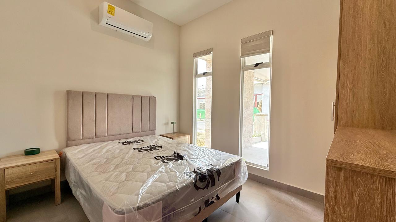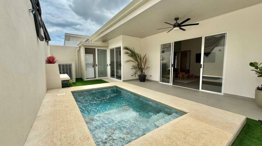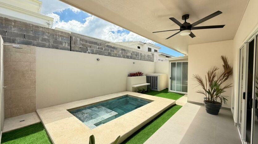 Las puertas de vidrio conectan el área social con la terraza y la piscina privada, logrando una integración ideal entre espacios interiores y exteriores. El patio cuenta con muro perimetral posterior, brindando mayor privacidad y seguridad para disfrutar del clima tropical.