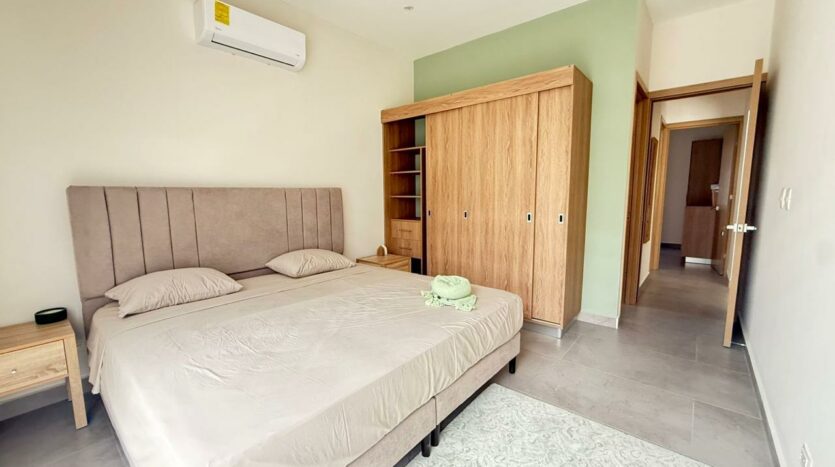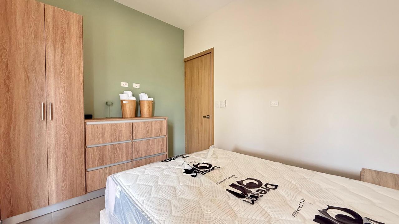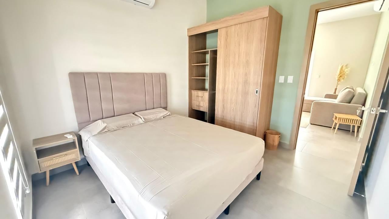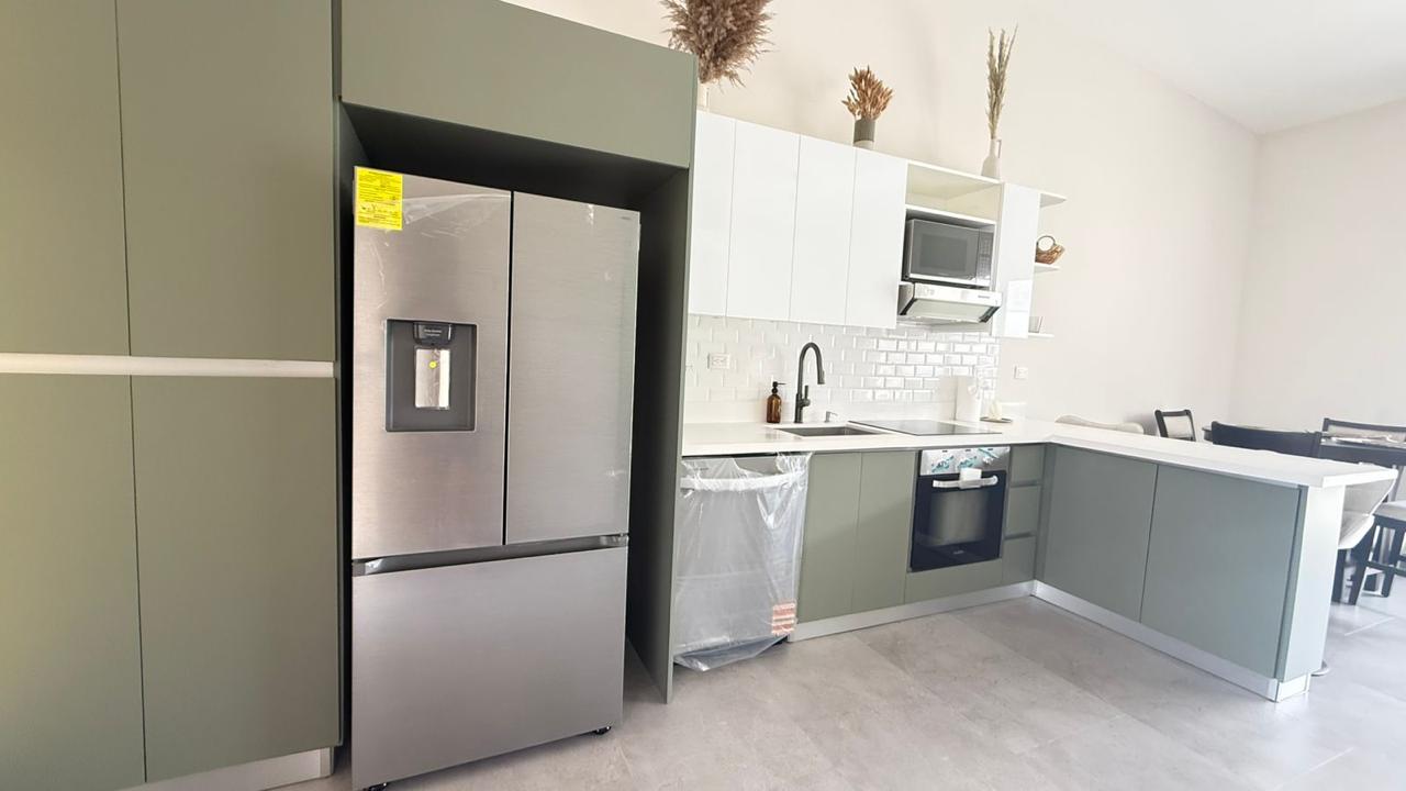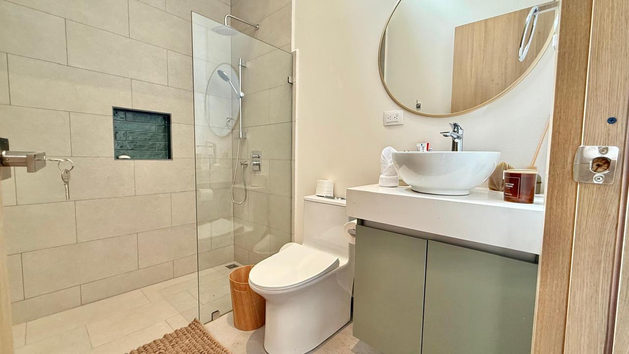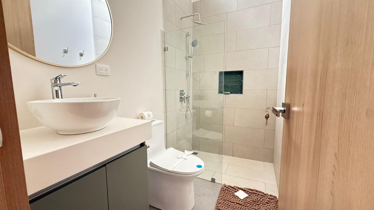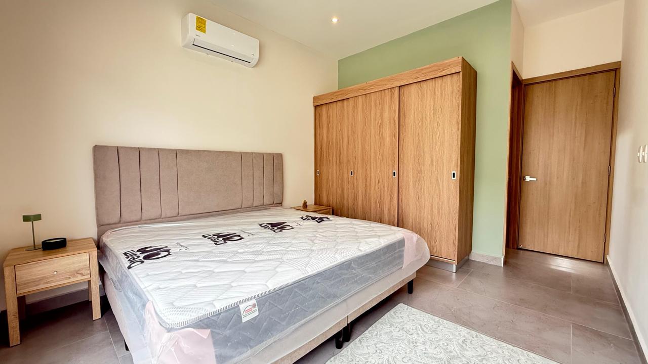 La propiedad cuenta con 3 amplias habitaciones, destacando la principal con baño privado, mientras que las habitaciones secundarias comparten un baño completo. Su diseño de concepto abierto integra la cocina —ubicada estratégicamente junto a la entrada principal— con la sala, creando un ambiente cómodo, luminoso y perfecto para compartir.