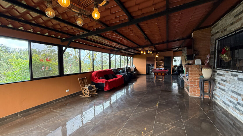 Amplia terraza interna con chimenea funcional