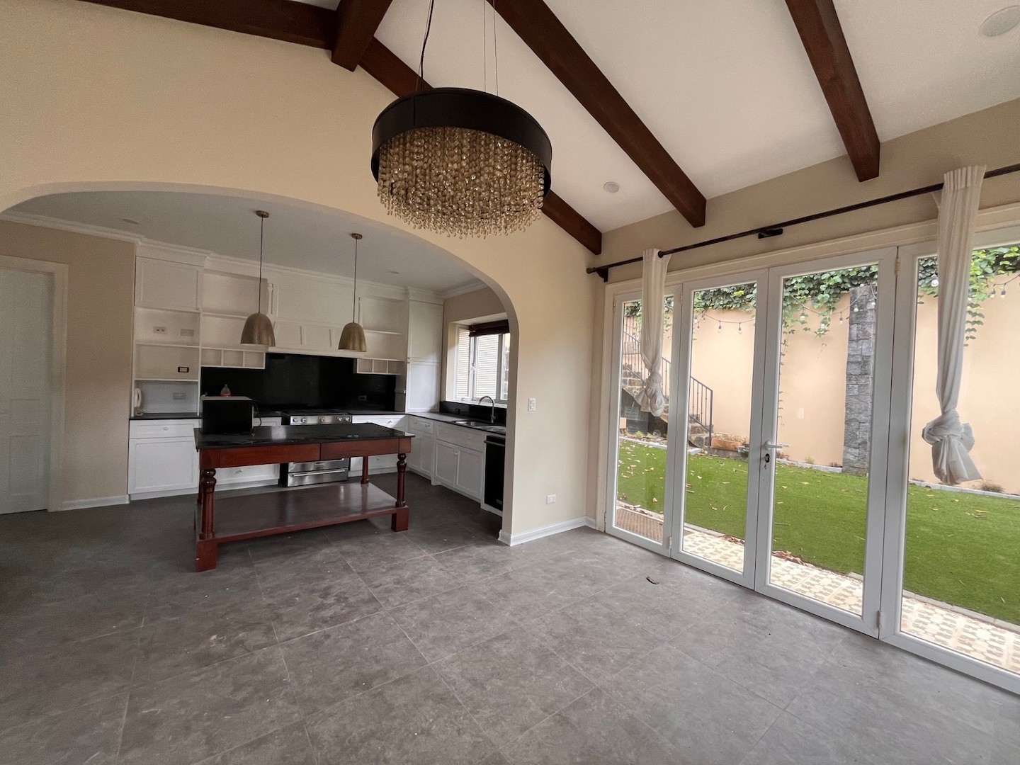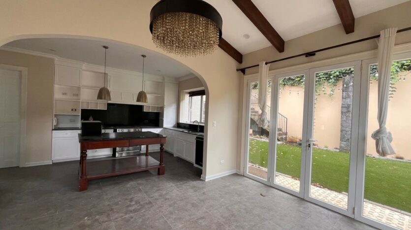 Casa semi contemporánea, techos de teja de barro, puertas de madera, sala doble altura con chimenea, cocina con comedor y línea blanca incluida, patio en tres niveles.