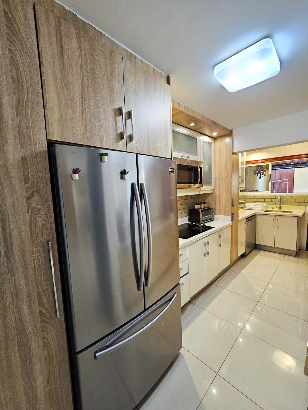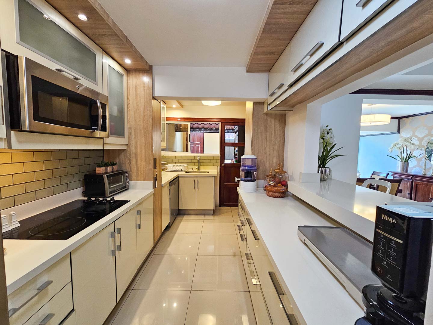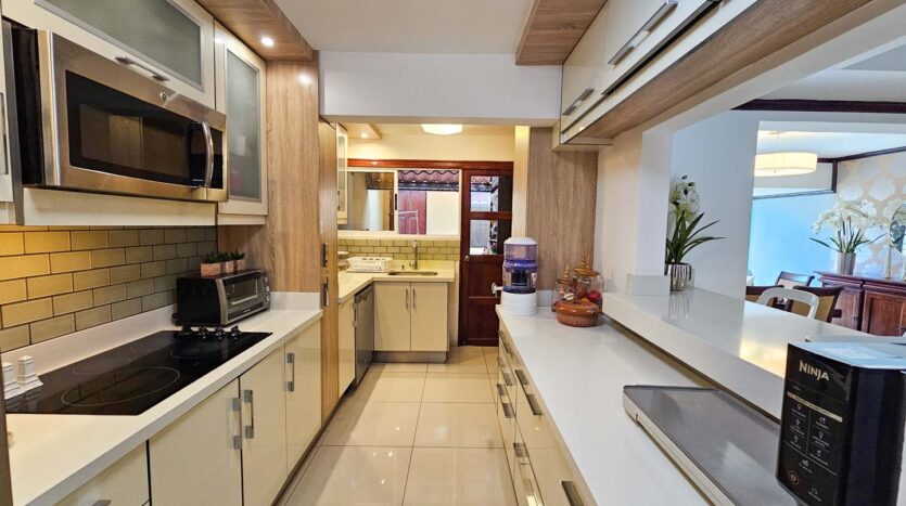 Esta casa posee en el primer nivel parqueo para 2 carros, sala-comedor y cocina en un espacio abierto, medio baño de visitas, cuarto de lavado, terraza trasera + cuarto de servicio con baño completo.