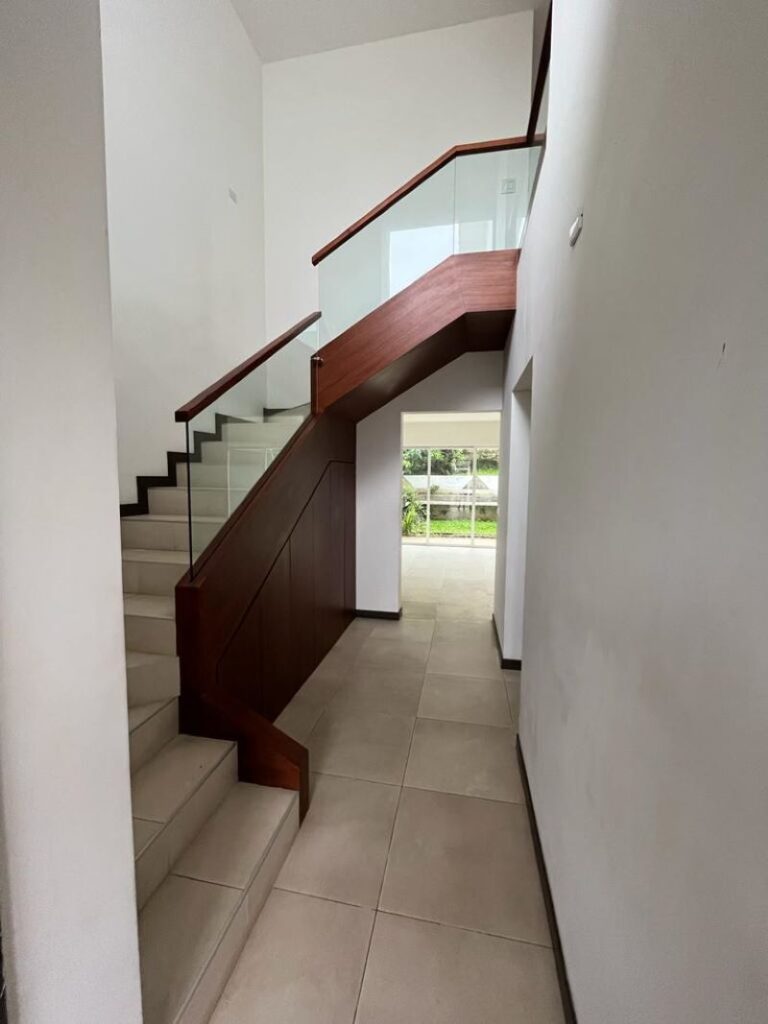 La casa de 2 plantas con sala comedor muy amplia, con cocina integrada, con habitación con propio baño en planta baja, 3 habitaciones en segunda planta con walk in closet, sala de tv, con parqueo para 4 vehículos